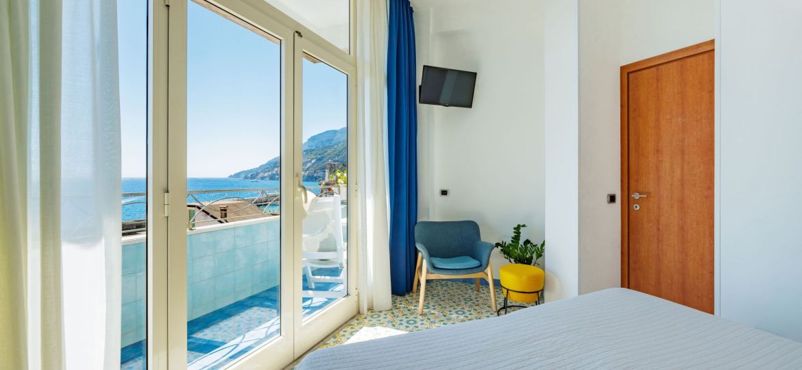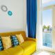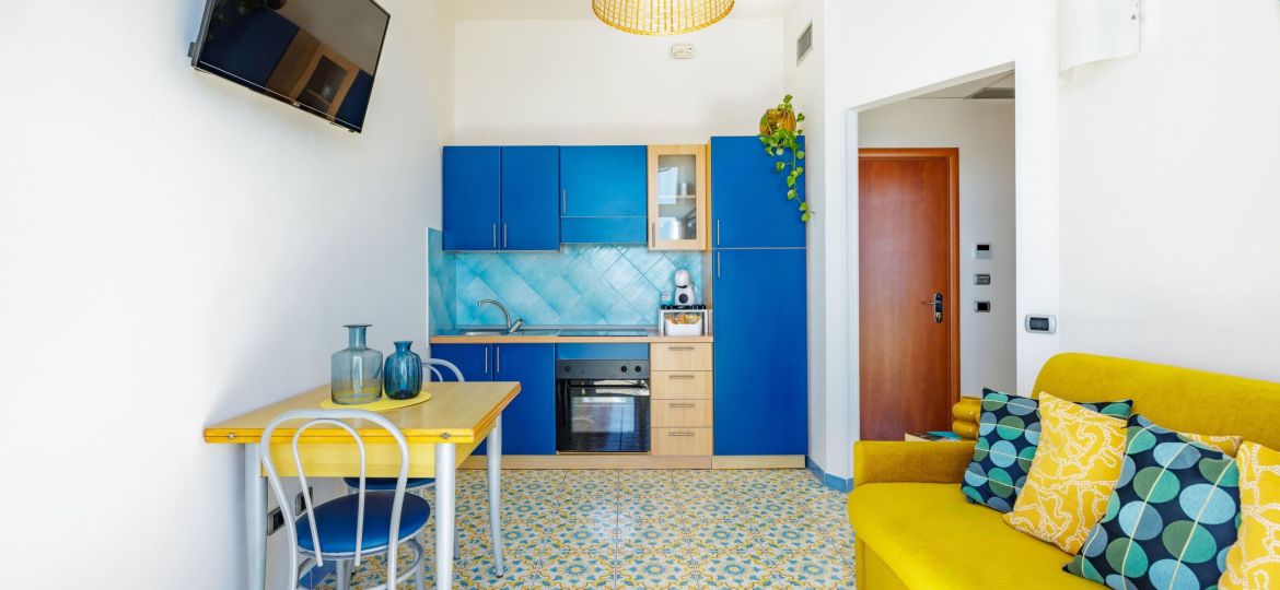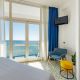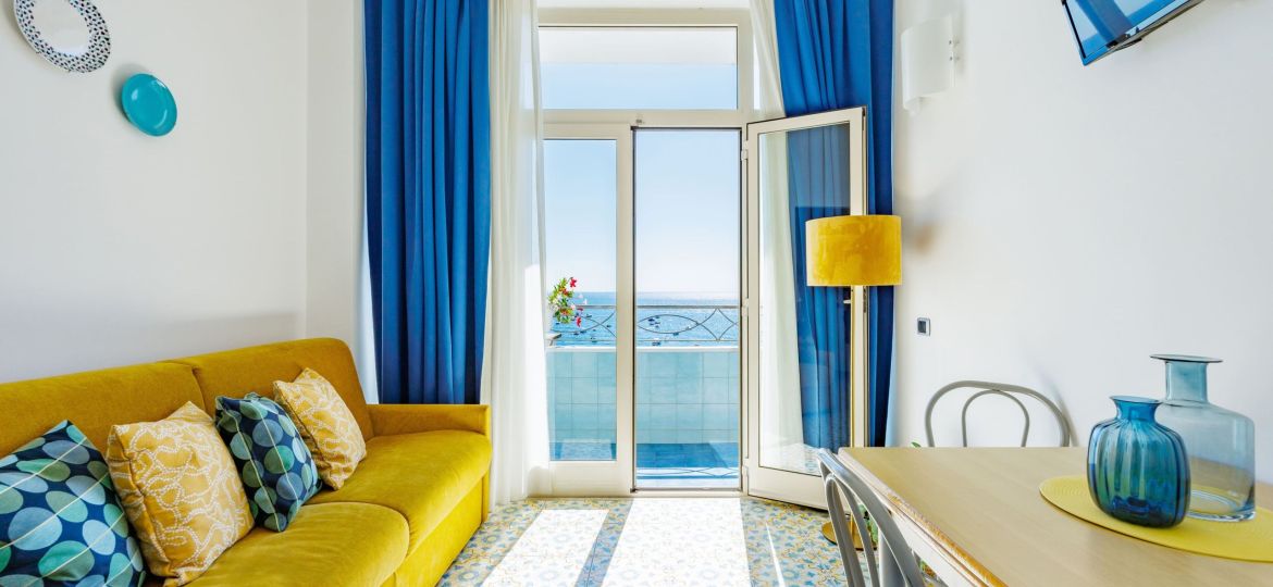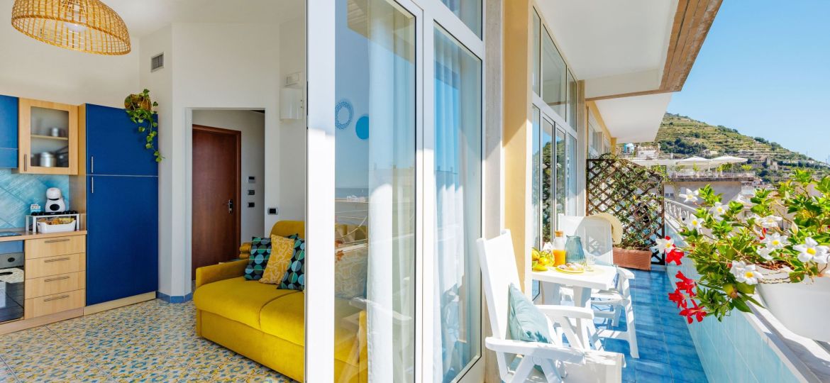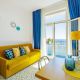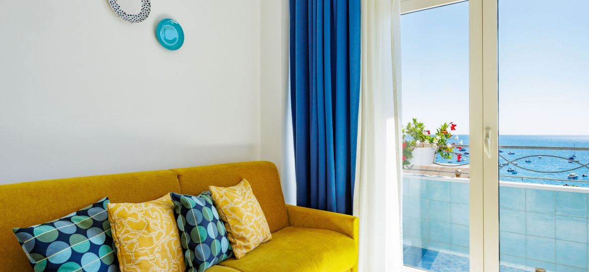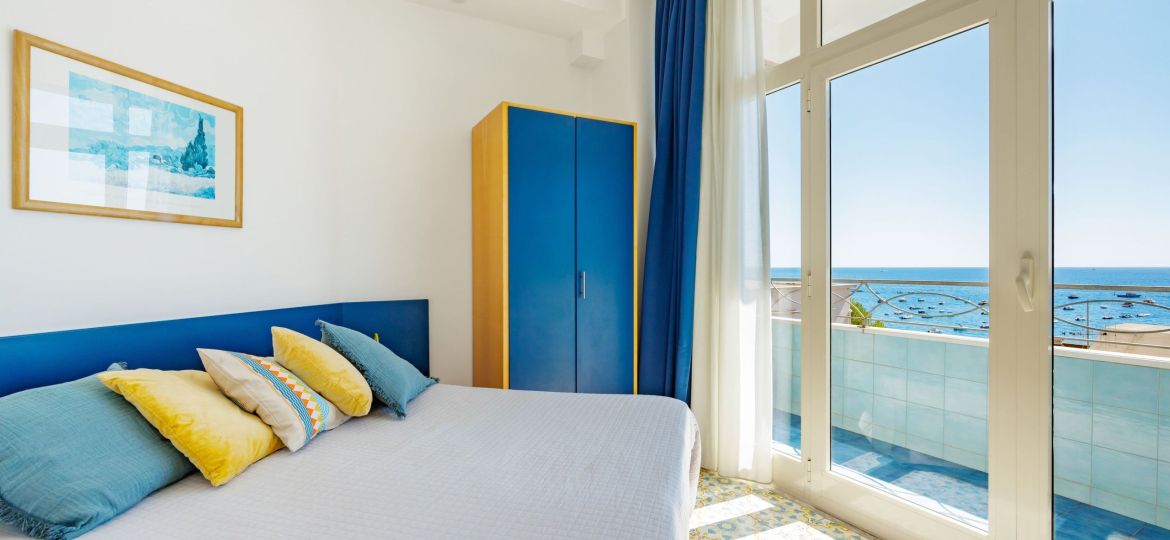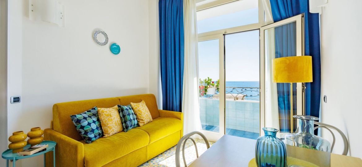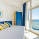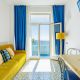 One bed room with double bed, living room with kitchenette, double sofa bed, bathroom and sea view balcony.
