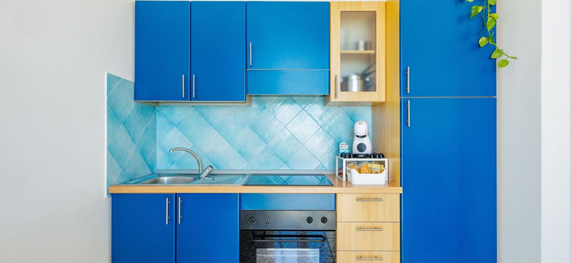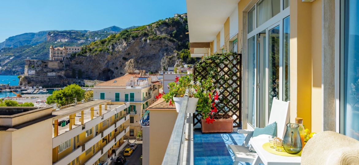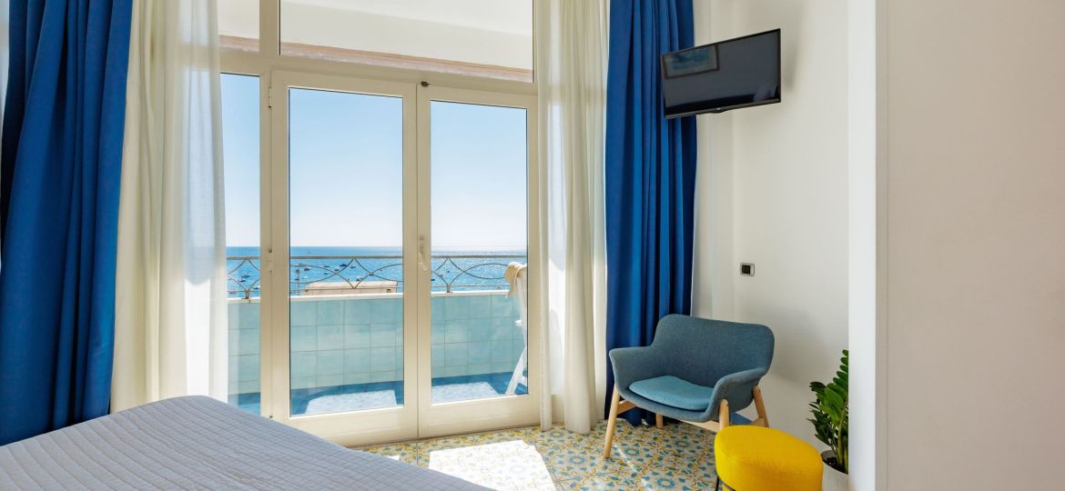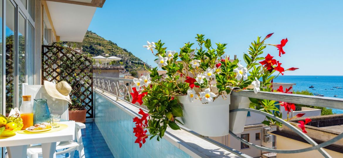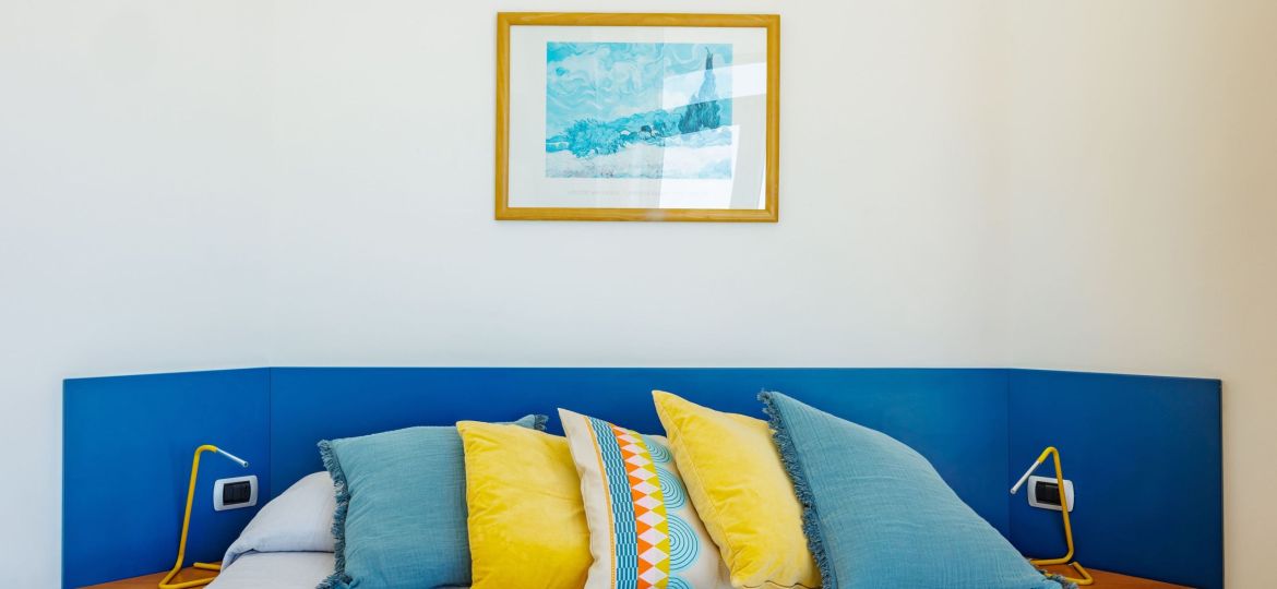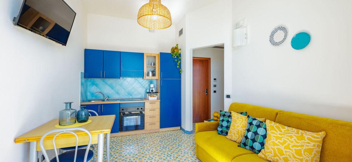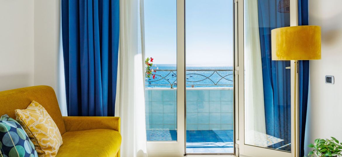 One bed room with double bed, living room with kitchenette, double sofa bed, bathroom and sea view balcony.